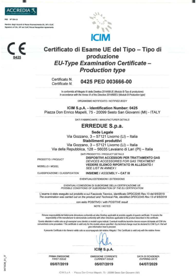 Home Certificazioni PED / Tipo di produzione dispositivi accessori per trattamento gas PED / Tipo di produzione dispositivi accessori per trattamento gas ,