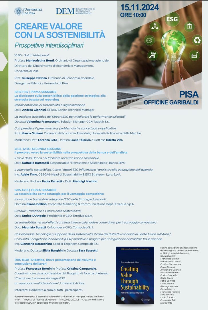 Home EventiCreare valore con la sostenibilità Creare valore con la sostenibilità Eventi, 15 Novembre 2024 15 Novembre 2024 Sant'Anna Pisa