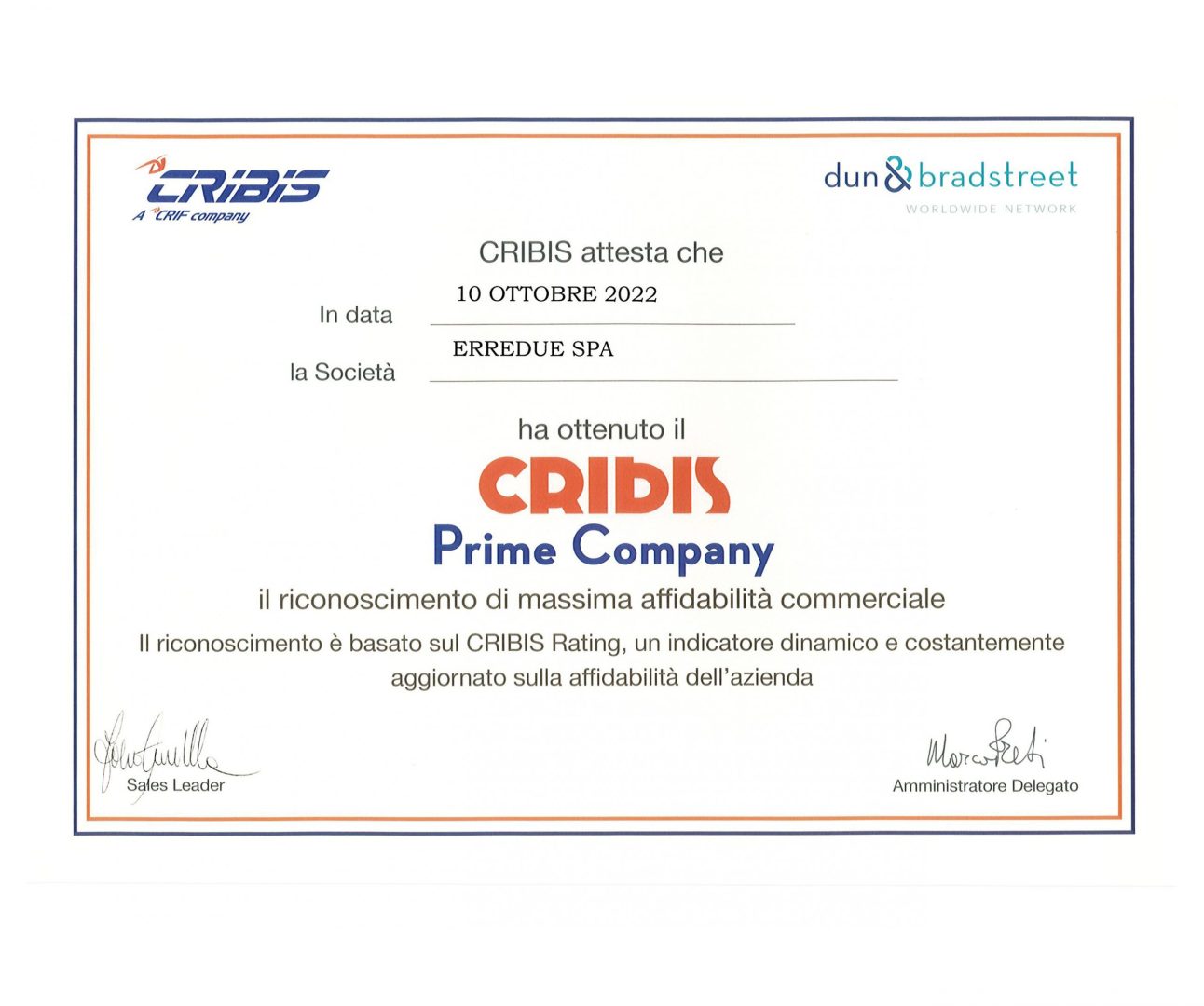 Erredue, on last 10th December,was awarded the renowned recognition Cribis Prime Company for the maximum commercial reliability level: a further proof of the warranty and reliability that Erredue is able to put into play in its own commercial relations.