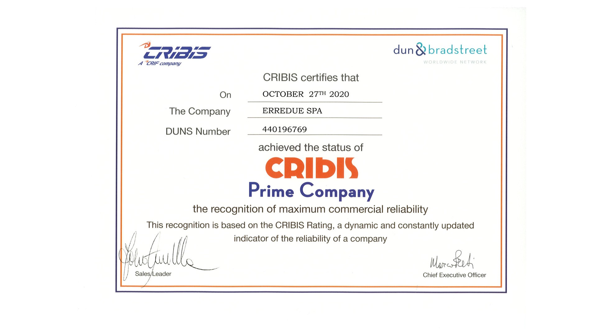 ErreDue è stata, infatti, insignita da Cribis D&B della certificazione di Prime Company: il massimo livello di valutazione dell’affidabilità di un’azienda. Cribis D&B è leader nella business information: per il rilascio della certificazione di Prime Company, Cribis D&B analizza approfonditamente l’azienda da certificare valutando numerose variabili e filtrandole attraverso un complesso indicatore dinamico costantemente aggiornato che misura in sintesi l’affidabilità commerciale dell’azienda.