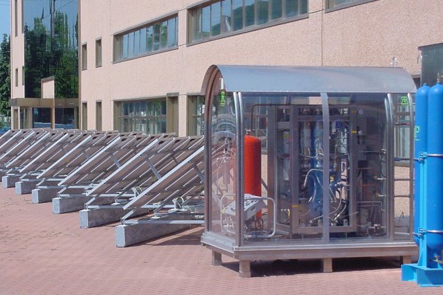 Generatore di idrogeno Mercury utilizzato per la ricarica di scooter con propulsione elettrica alimentata a fuel cell in Svizzera. Il generatore è alimentato da pannelli solari.