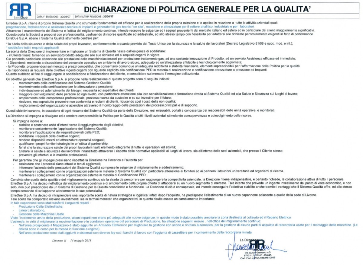 Erredue S.p.A. ritiene il proprio Sistema Qualità uno strumento fondamentale ed efficace per la realizzazione della propria missione e lo applica in relazione a tutte le attività aziendali.